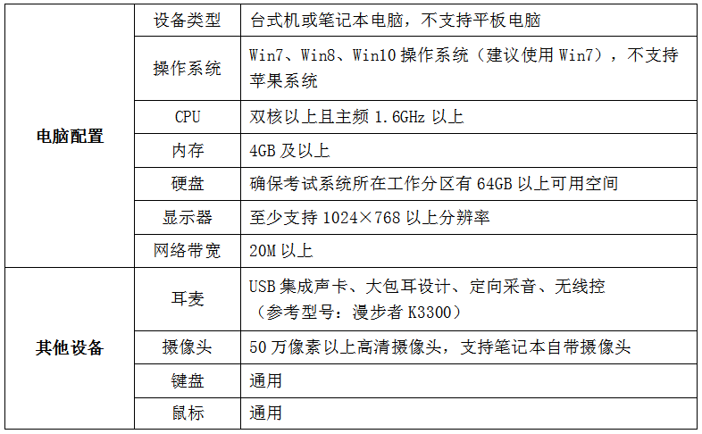1.设备要求:考生需自备电脑、耳机,确保网络环境畅通,下载及登录在线考试系统参加考试,具体要求如下: